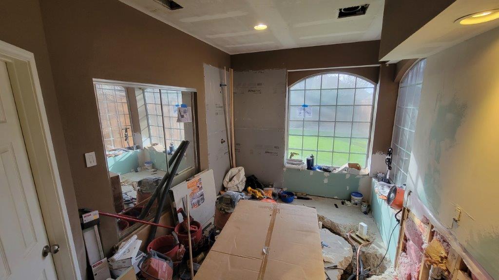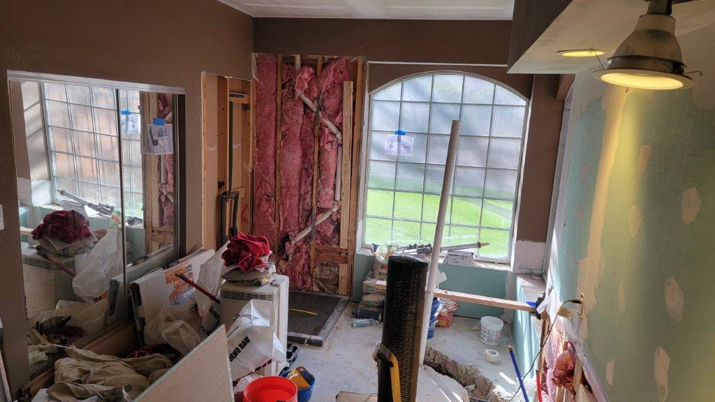 in the middle of all the plumbing work, the electricians were able to get in and do a bit of work. no more jetted tub so that line was reused for a new gfi circuit. can’t have too many outlets.