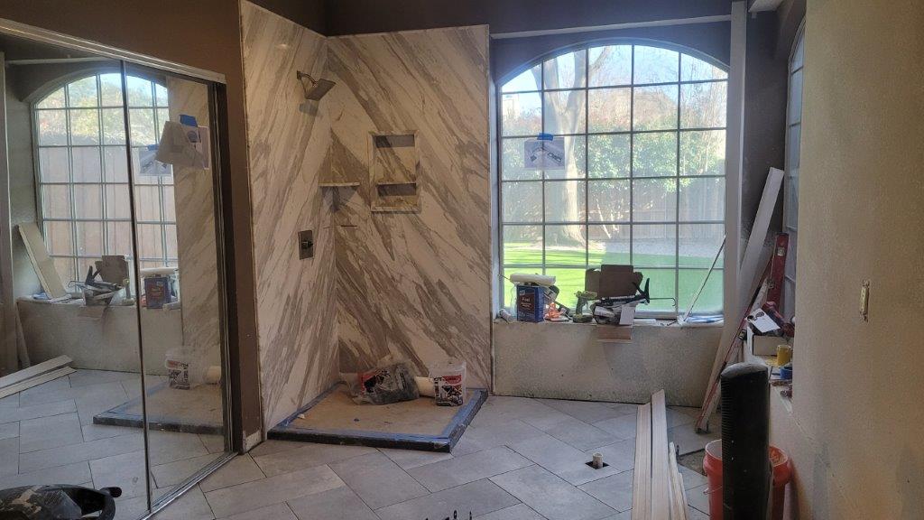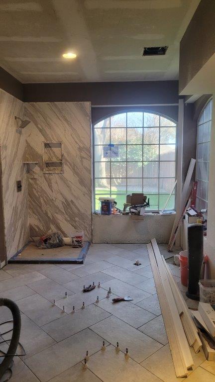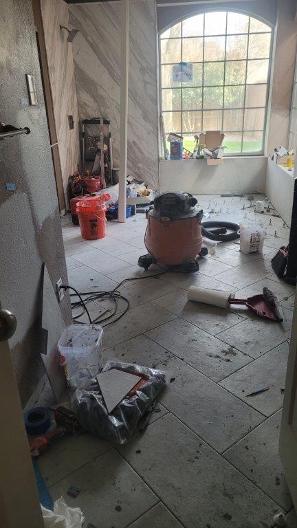 it’s tuesday and you guessed it. more tile. i can’t say that I minded them being slow and meticulous. this is the day when they started to do a bunch of the edges. apparently, our bathroom has a bunch of random angles and required a whole bunch of cutting. you can see the cardboard stencils they were making that then translated to some intricately cut tiles.